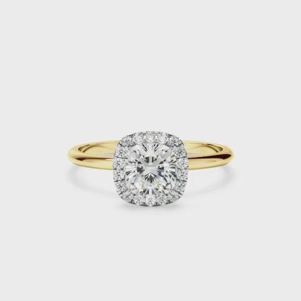This timeless custom-made engagement ring, made with your choice of diamond centre stone, features a cushion cut diamond adorned in a halo of round brilliant cut diamonds. Exuding fluidity in its line work, and boasting an elegant silhouette, as with all the pieces in our Bespoke Collection, this piece is made especially for you.