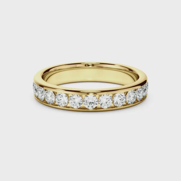 This stunning custom-made wedding ring features a half band of round brilliant diamonds set on an 18ct gold or platinum band. Exuding fluidity in its line work, and boasting an elegant silhouette, as with all the pieces in our Bespoke Collection, this piece is made especially for you.
