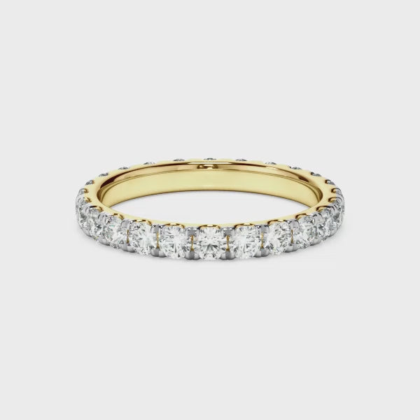 This stunning custom-made eternity wedding ring features a full band of round brilliant cut diamonds set on an 18ct gold or platinum band. Exuding fluidity in its line work, and boasting an elegant silhouette, as with all the pieces in our Bespoke Collection, this piece is made especially for you.