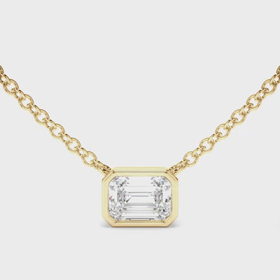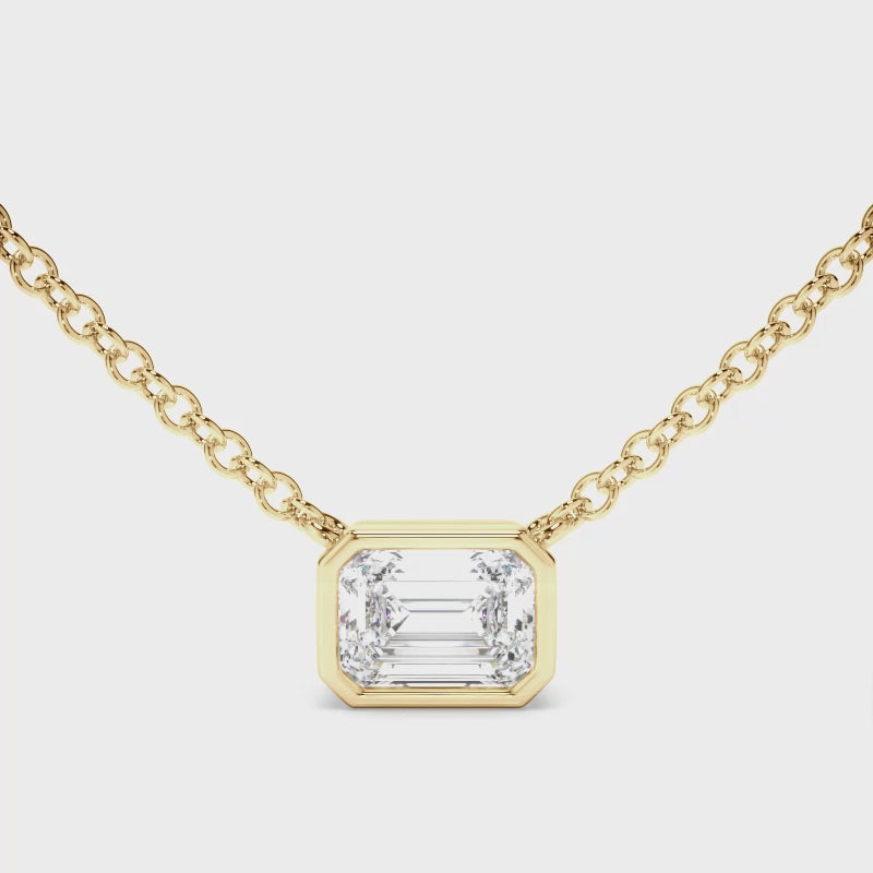 This elegant diamond bezel set solitaire necklet is made with your choice of diamond centre stone and includes a 45cm 18ct gold chain. Exuding fluidity in its line work, and boasting an elegant silhouette, as with all the pieces in our Bespoke Collection, this piece is made especially for you. Pictured here with a 1.50ct Emerald Cut Diamond centre stone, a final price is determined following your centre stone selection.