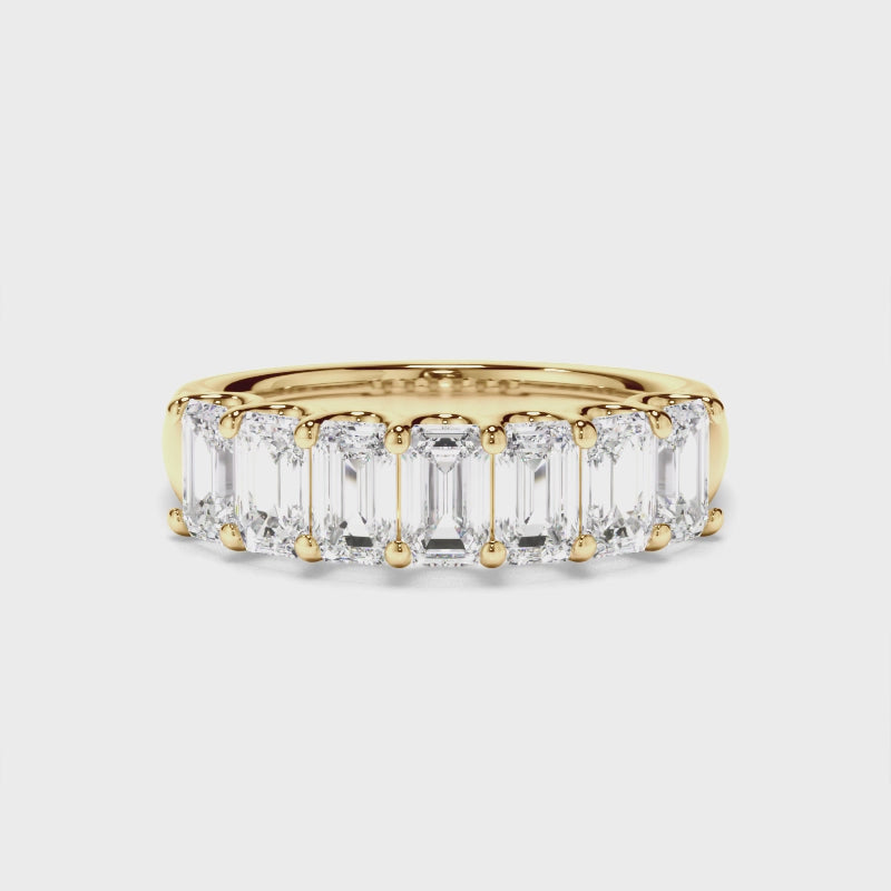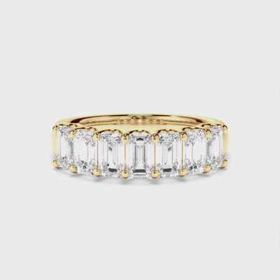 This stunning custom-made anniversary ring features a half band of emerald cut diamonds set on an 18ct gold or platinum band. Exuding fluidity in its line work, and boasting an elegant silhouette, as with all the pieces in our Bespoke Collection, this piece is made especially for you.