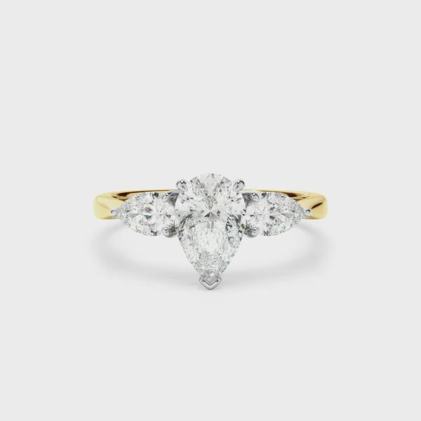 - Side stones: 2 x 0.30ct Pear Cut E+ VS+ Laboratory-Grown Diamonds = 0.60ct TDW