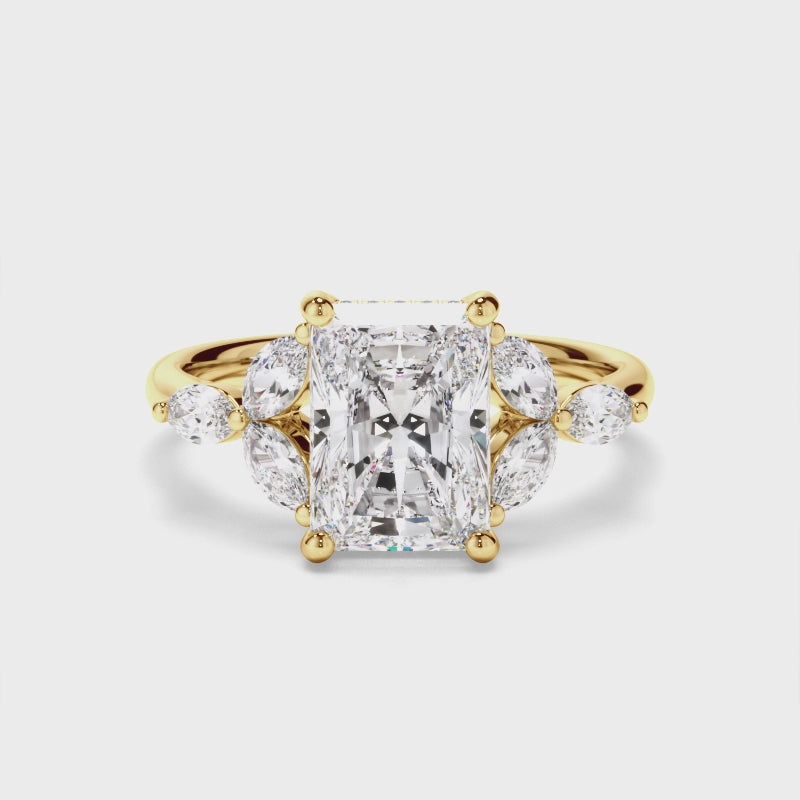 This timeless custom-made radiant cut diamond engagement ring, made with your choice of diamond centre stone, featuring marquise cut accent side stones set in a classic half round band. Exuding fluidity in its line work, and boasting an elegant silhouette, as with all the pieces in our Bespoke Collection, this piece is made especially for you.
