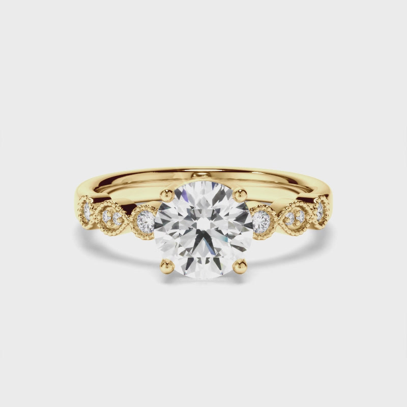 This timeless custom-made round brilliant cut diamond engagement ring, made with your choice of diamond centre stone, features diamond accent stones and milgrain detailing. Exuding fluidity in its line work, and boasting an elegant silhouette, as with all the pieces in our Bespoke Collection, this piece is made especially for you.